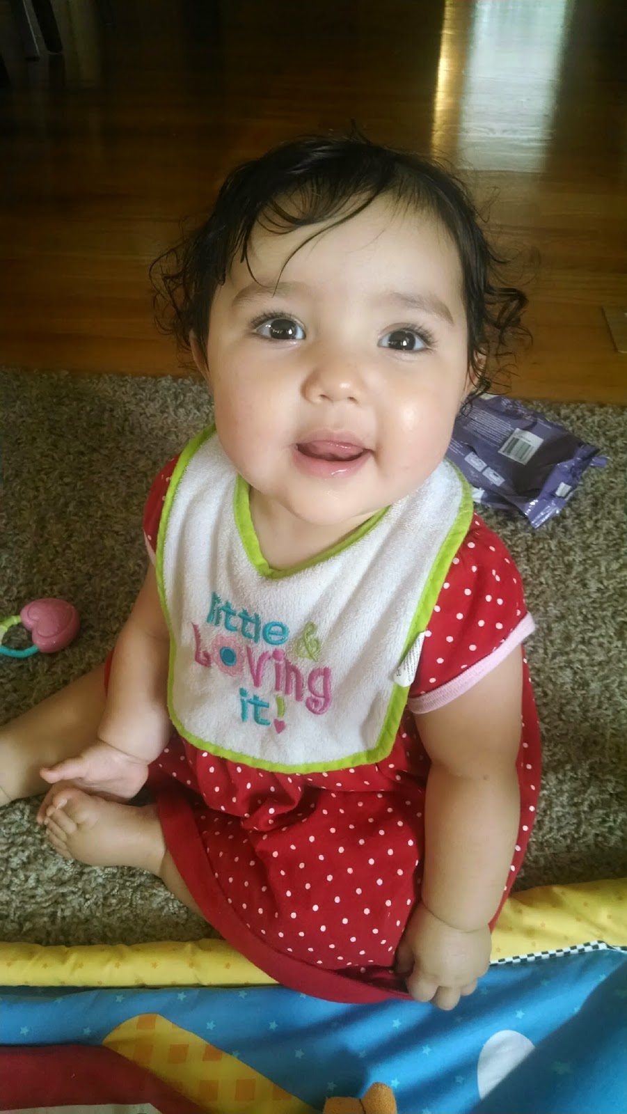 You are not such a baby anymore! You seem to be turning into a little girl. You can crawl a little bit. It's still a bit of an army crawl, as you carry one leg being you. You can roll very well though. You make it across rooms somehow when I turn my back!